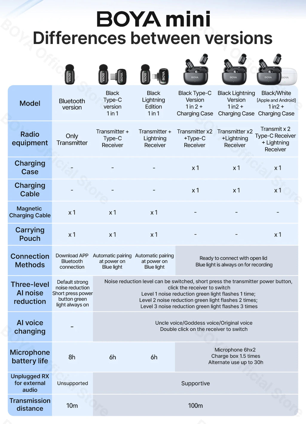 The BOYA mini, an ultra-compact and portable 2.4 GHz wirelessmicrophone system, features automatic re-connection and selectablenoise reduction that offer remarkable flexibility for recording.lt adoptsspecific Al algorithms for changing your voice in real time to provide ahighly pleasurable listening experience. With ease of operation, themicrophone system is compatible with smartphones, tablets, computers,and more.The BOYA mini is ideal for content creation, live streaming,vogging,mobile journalism, and much more.