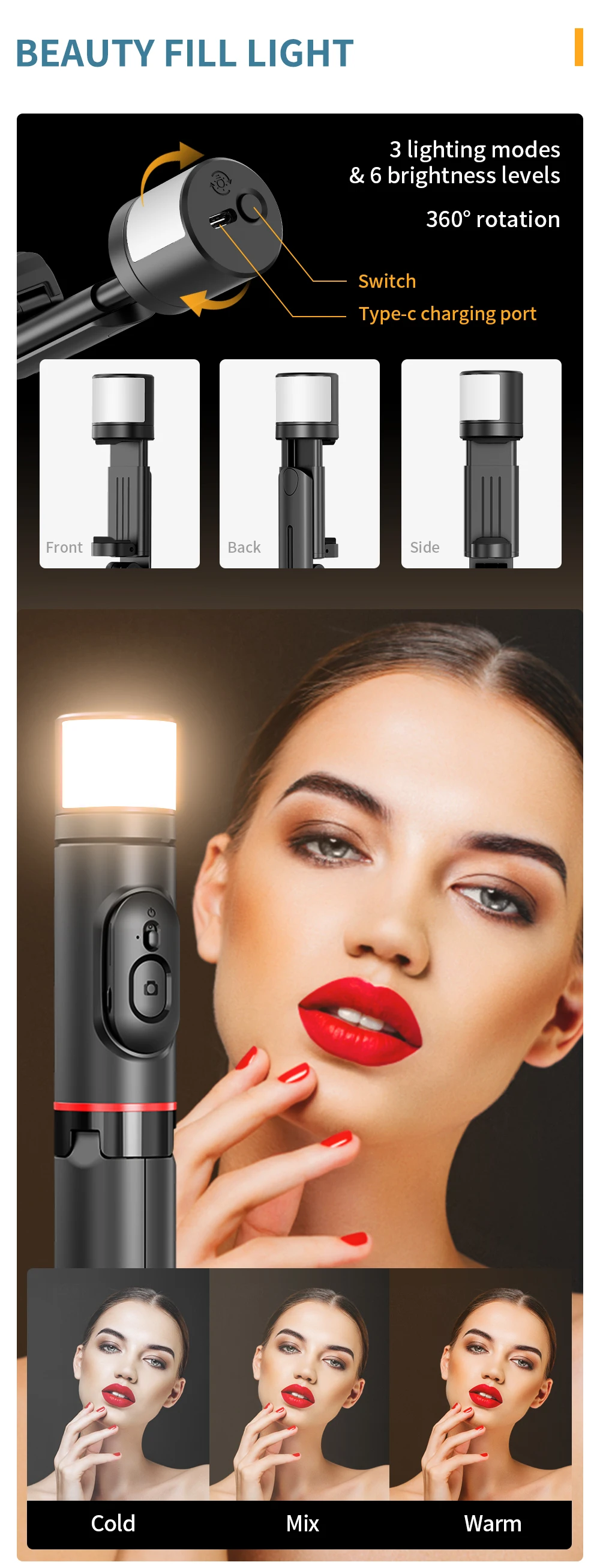 O design do tripé de selfie com controle remoto combina praticidade, permitindo que você ajuste livremente sua altura para atender a diferentes necessidades em diferentes ocasiões. Seu peso é muito leve, não lhe trará nenhum fardo quando usado e é fácil de transportar. Você pode facilmente colocá-lo em sua mochila, tornando-o o companheiro de viagem perfeito