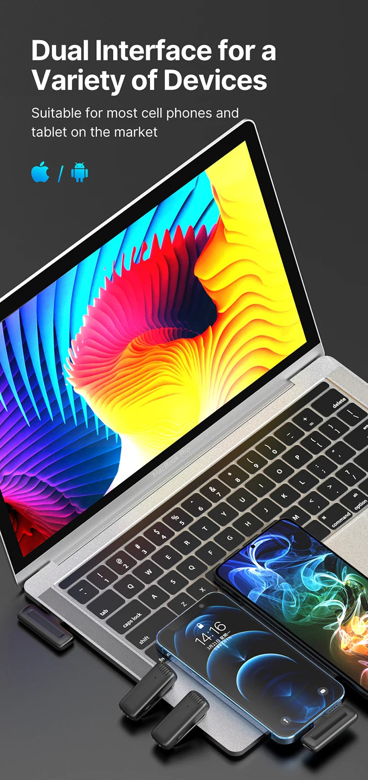 2.Plug and Play: basta prender o microfone sem fio ULANZI ao colarinho, conectar o receptor Lightning ao seu dispositivo e eles se conectarão automaticamente.APP e Bluetooth não são necessários.Torne sua transmissão ao vivo mais fácil e agradável!