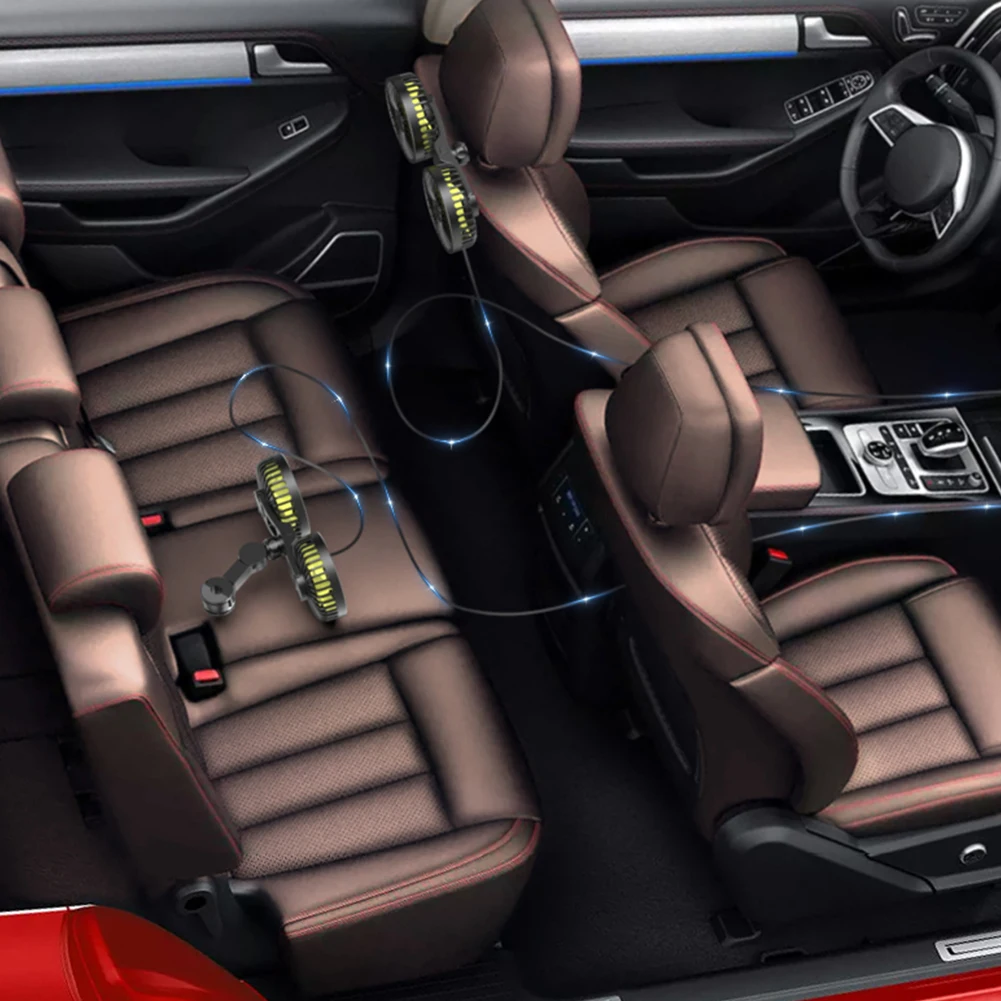 2. Design de núcleo eficiente: Equipado com um motor dual-core de cobre puro, nosso ventilador de ventilação com encosto de cabeça automático oferece um desempenho poderoso com um forte fluxo de ar, tornando cada passeio de carro uma experiência mais fresca e agradável.